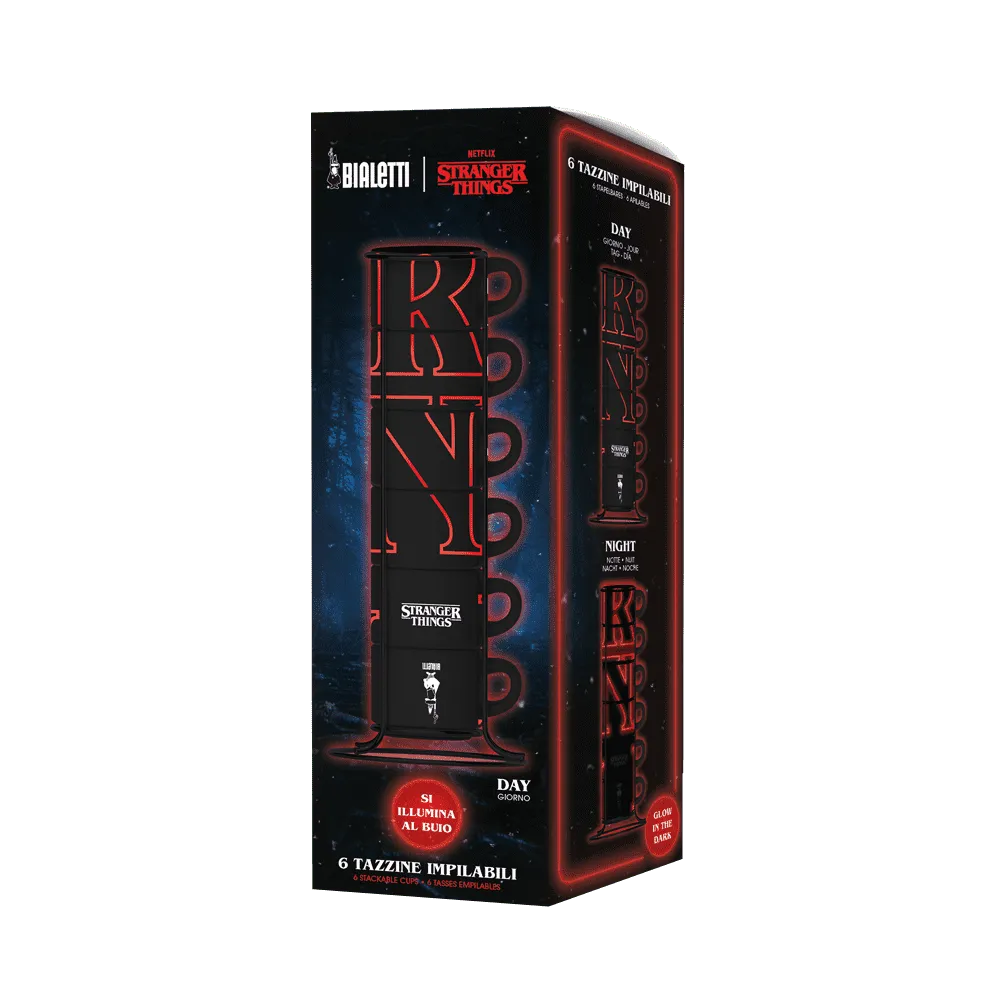 Tra i prodotti con l'effetto Glow in the Dark, il set di impilabili Bialetti non poteva mancare. Sei tazzine l'una sopra l'altra, nere, ricorperte dalle celebri lettere della serie Stranger Things. Grazie all'effetto luminescente, le lettere rosse si illuminano al buio, ricreando la celebre scritta.
